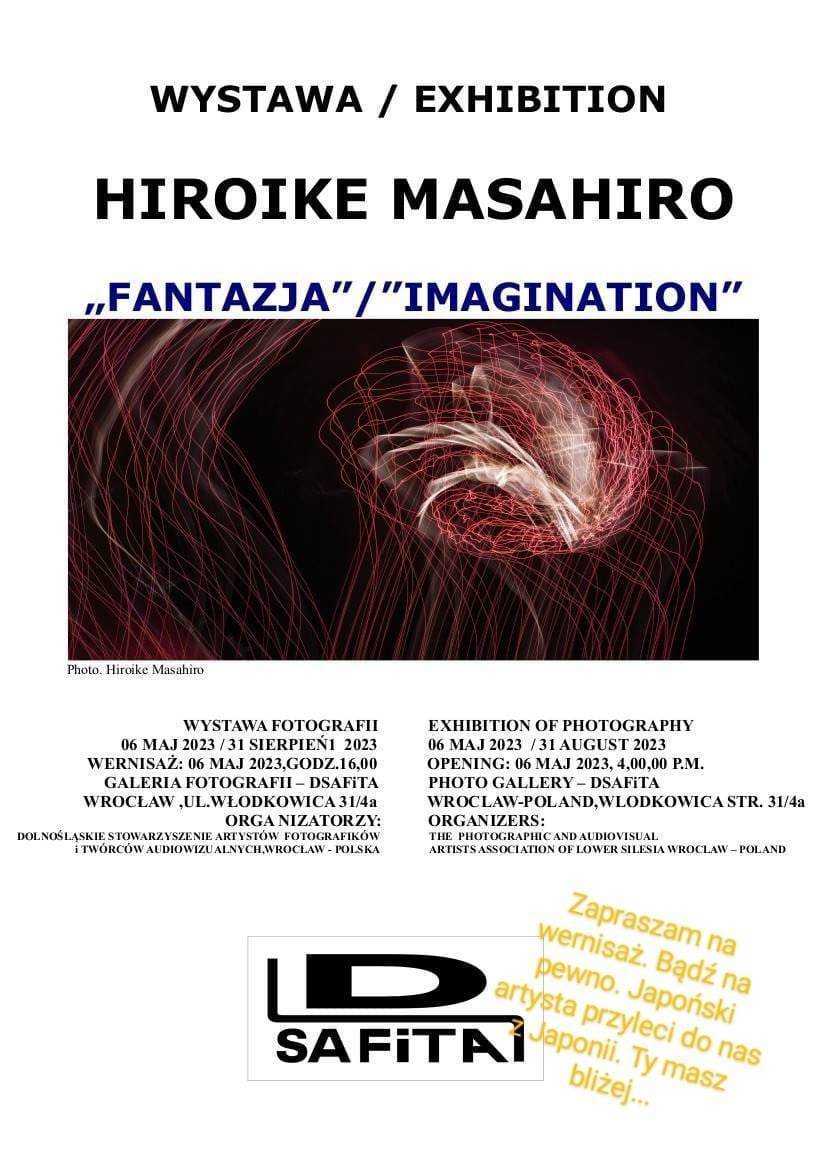 Po uroczystym otwarciu wystawy Japońskiego artysty w dniu 02.05.2023 r. o godzinie 17.00 w MUZEUM PRZYRODNICZYM w Jeleniej Górze -Cieplice,w dniu 06.05.2023 r., nastąpiło uroczyste otwarcie wystawy fotograficznej Hiroike Masahiro w „Galerii Fotografii Dolnośląskiego Stowarzyszenia Artystów Fotografików i Twórców Audiowizualnych z siedzibą we Wrocławiu przy ulicy Pawła Włodkowica 31 lokal nr 4A . Na otwarcie wystawy przybyli członkowie Stowarzyszenia oraz zaproszeni goście i mieszkańcy Wrocławia. Otwarcia wystawy dokonał prezes Stowarzyszenia Zbigniew Stokłosa wraz z autorem wystawy Hiroike Masahiro, który na wernisaż przyleciał wraz z żoną z Japonii. Podczas pobytu w Polsce japoński artysta fotografował Wrocław oraz wiele innych miast naszego kraju. Do Polski przyleciał 25 kwietnia 2023r., a do Japonii odlatuje 15 maja 2023 r. Bogaty materiał fotograficzny posłuży mu do zorganizowania w Japonii wystawy o Polsce. Hiroike Masahiro zrealizował także filmy ze swoich wernisaży oraz z pobytu w Polsce dla czterech japońskich stacji telewizyjnych, które (głównie relacje z wernisaży) wysyłał drogą elektroniczną na bieżąco do Japonii. (wkrótce więcej zdjęć z wernisażu w Galerii DSAFiTA).